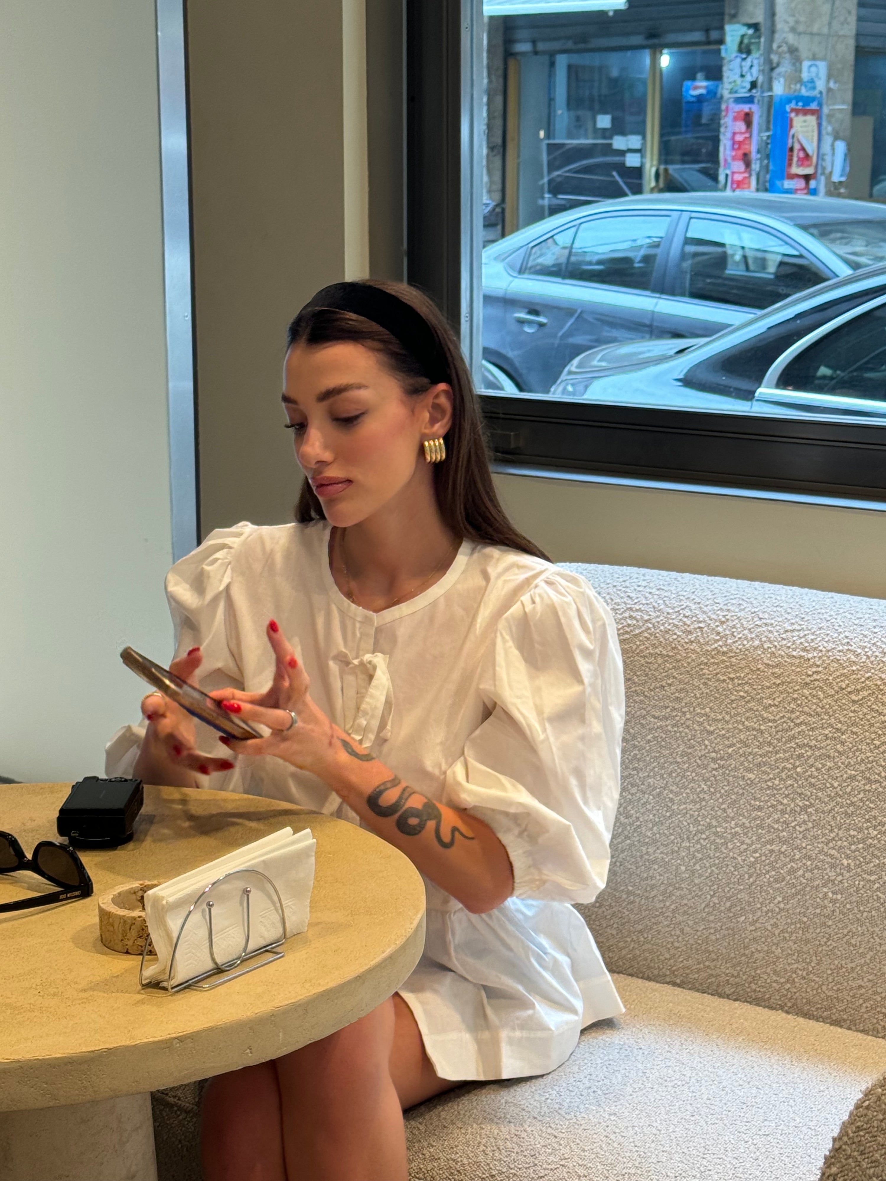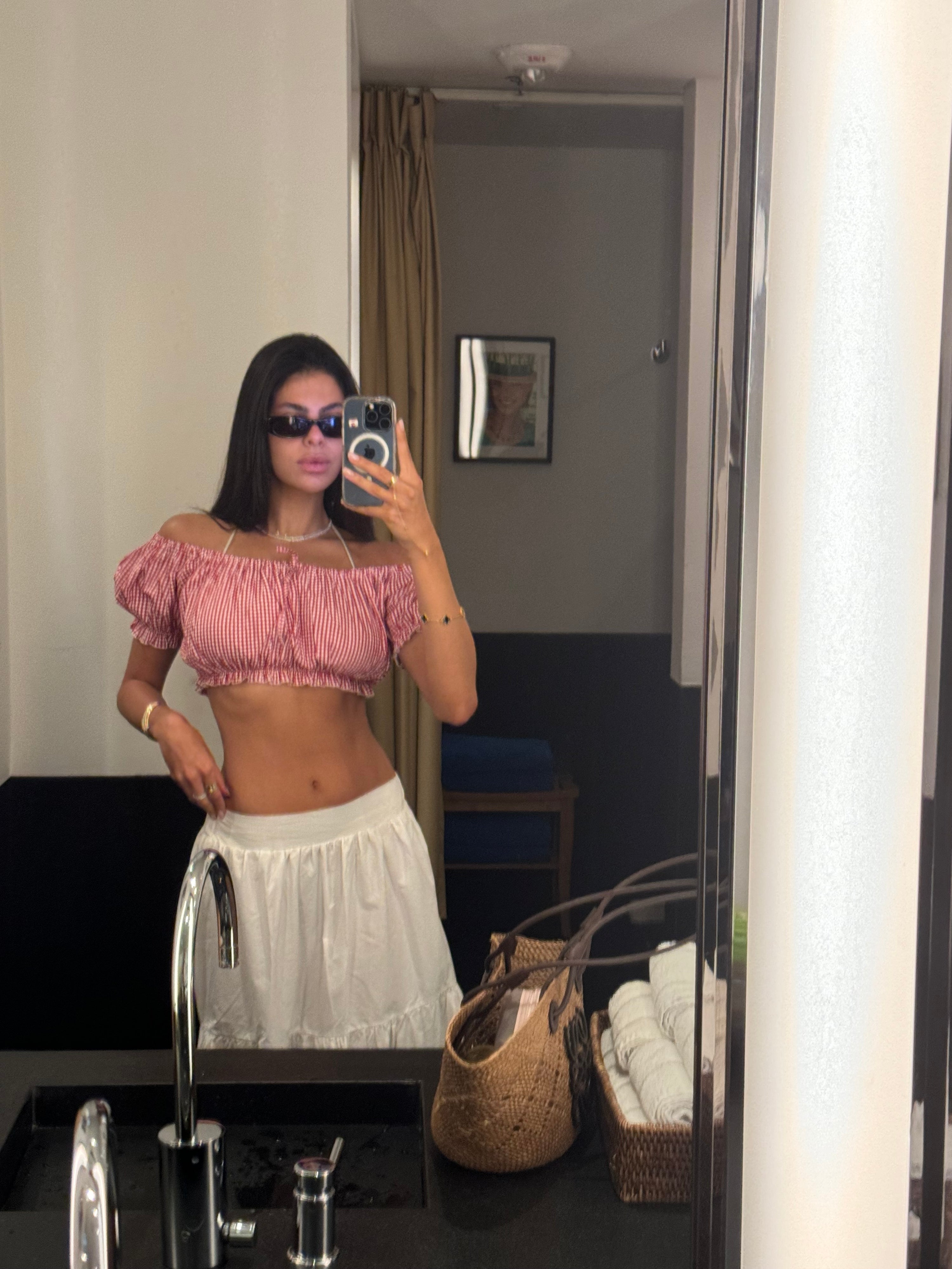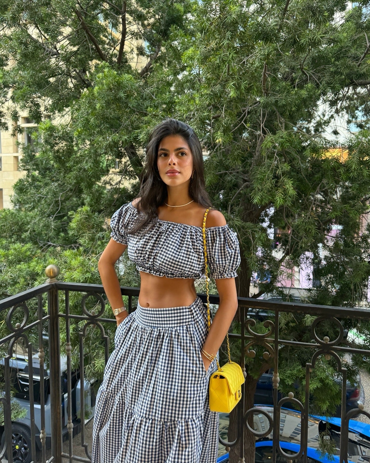 Playful bubble mini skirt paired with a matching cropped shirt, finished with the signature logo detail Matching scrunchie with embroidered...