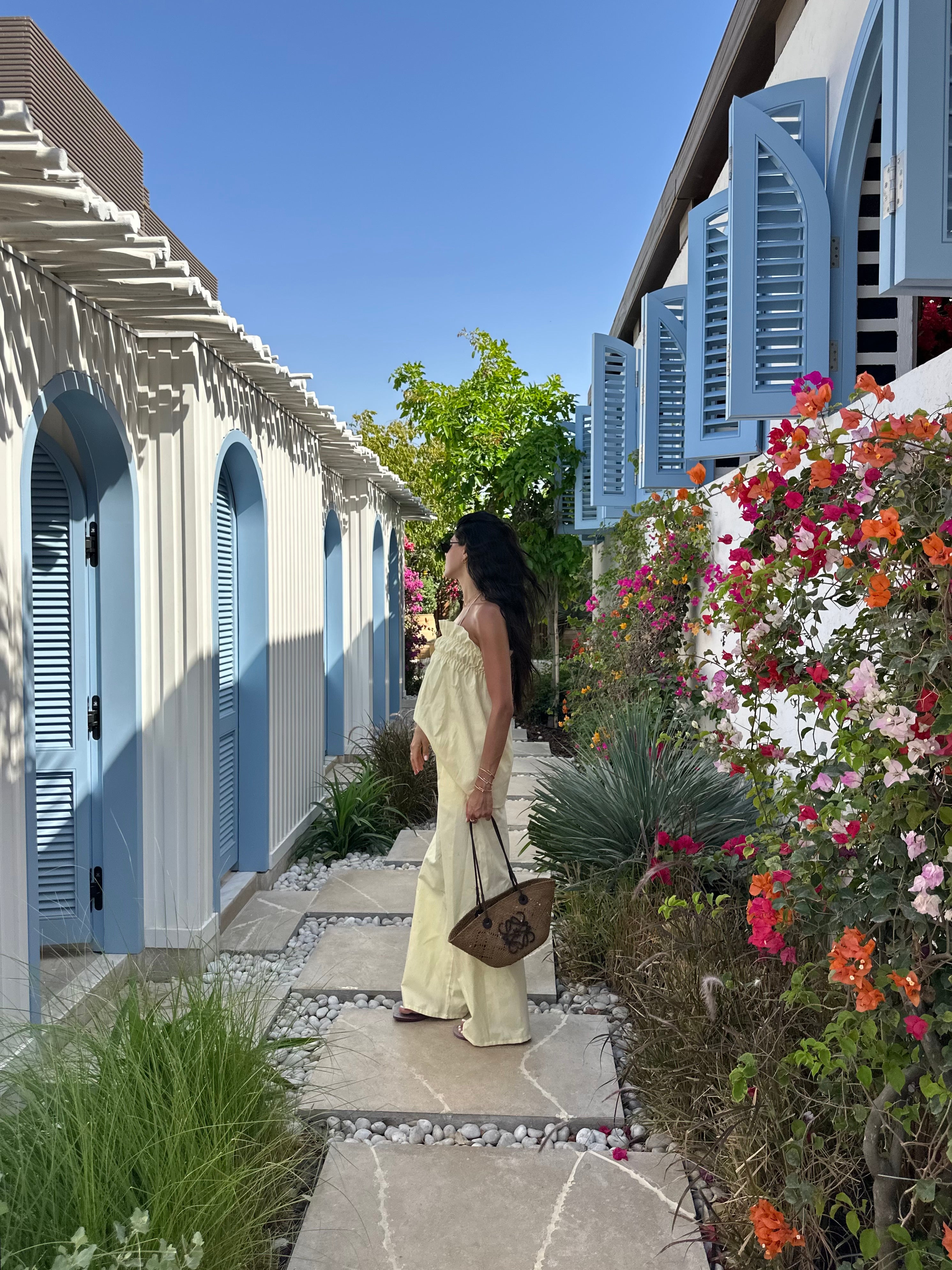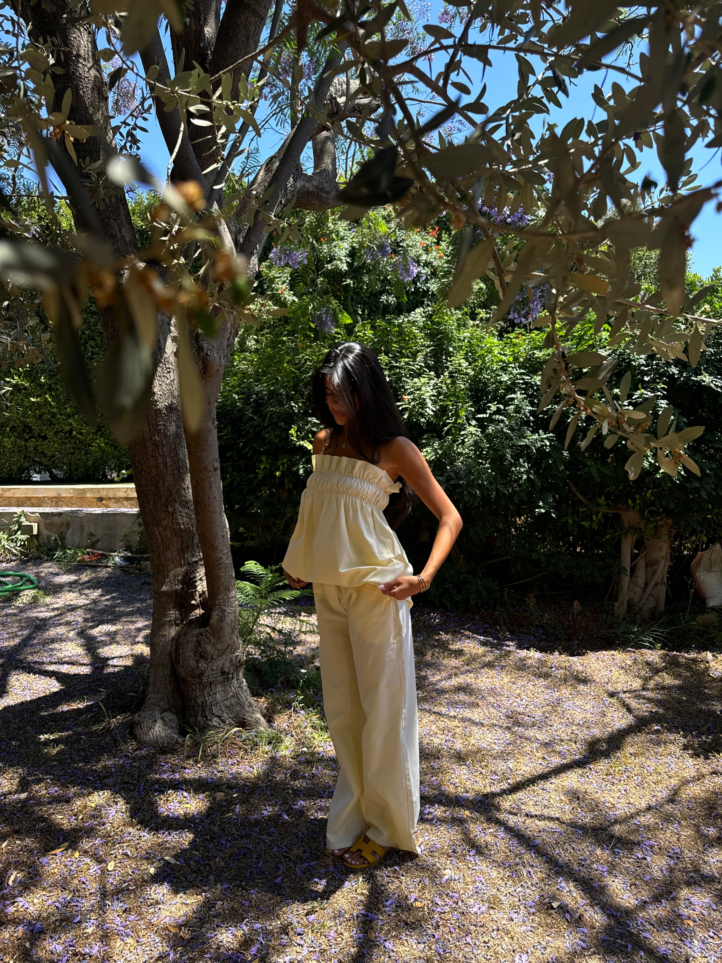 A butter-yellow knitted set featuring a buttoned cardigan with flared sleeves and matching shorts for an easy, feminine look